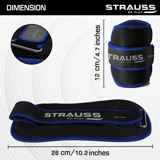 Strauss Adjustable Ankle/Wrist Weights 0.5 KG X 2 | Ideal for Walking, Running, Jogging, Cycling, Gym, Workout & Strength Training | Easy to Use on Ankle, Wrist, Leg, (Blue)