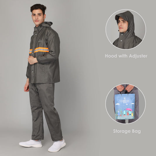 THE CLOWNFISH Rain Coat for Men Waterproof Raincoat with Pants Polyester Reversible Double Layer Rain Coat For Men Bike Rain Suit Rain Jacket Suit Inner Mobile Pocket with Storage Bag (Grey XXL)