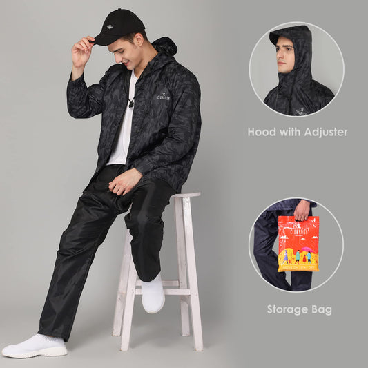 THE CLOWNFISH Rain Coat Waterproof Full Length Raincoat With Pants Polyester Reversible Double Layer Rain Coat For Men Bike Rain Suit Rain Jacket Suit Inner Mobile Pocket With Storage Bag(Black Xxl)