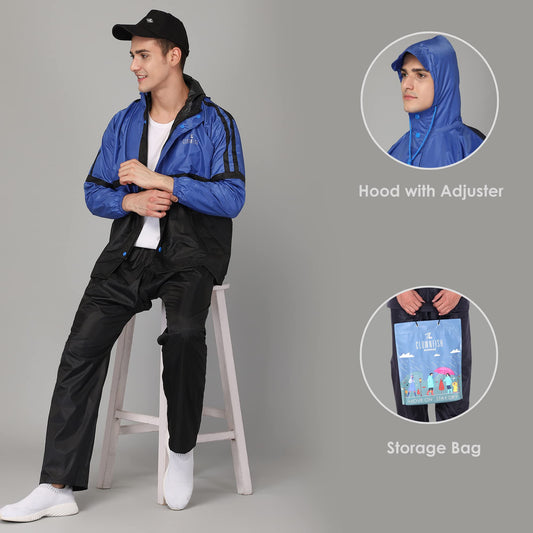 THE CLOWNFISH Rain Coat For Men Waterproof Raincoat With Pants Polyester Reversible Double Layer Standard Length Rain Coat For Men Bike Rain Suit Inner Mobile Pocket With Storage Bag(Royal Blue)Large