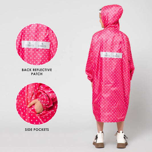 The Drizzle Dot Series Kids Raincoat Waterproof Polyester Double Coating Reversible Longcoat with Hood and Reflector Logo at Back. Printed Plastic Pouch. Kid Age-13-14 years (Bubblegum Pink)