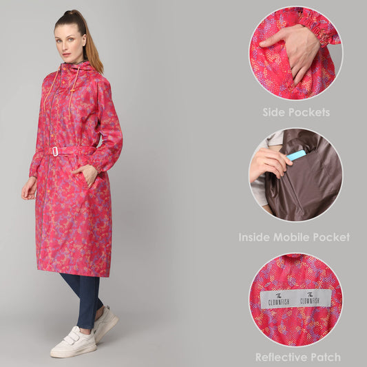 THE CLOWNFISH Polyester Waterproof Rain Coat For Women Skirt and Top Raincoat With Adjustable Hood and Front Pockets Rain Glam Series (Pink Floral, X-Large)