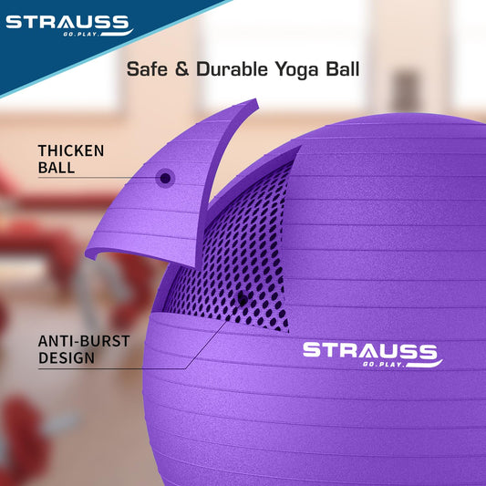 STRAUSS Anti-Burst Rubber Gym Ball with Free Foot Pump | Round Shape Swiss Ball for Exercise, Workout, Yoga, Pregnancy, Birthing, Balance & Stability, 65 cm, (Purple)
