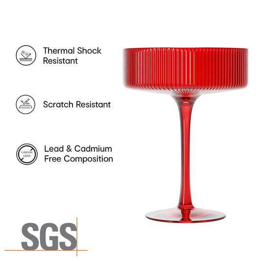 Australia 200ml Ribbed Champagne Coupe | Set of 4 | Cocktail Glass Set | Bar Accessories for Home, Restaurant & Parties | Suitable for All Occassions | Red