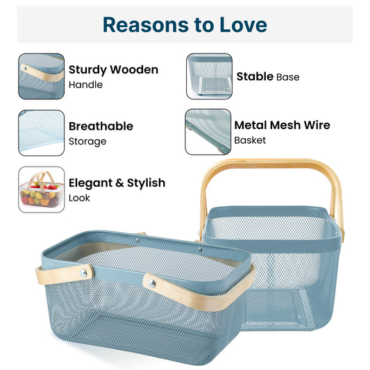 Metal Mesh Basket for Storage with Wooden Handle (Blue - 400gm) | Pack of 2 | Baskets for organizing home | Fruit Basket and Vegetable basket for kitchen | Organisers Storage Box |