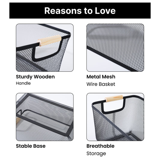 Metal Mesh Basket for Storage with wooden handle | 400gm | Fruit Basket & Vegetable Basket for Kitchen | Kitchen Organizer | Baskets for Organizing Home | Multipurpose | Pack of 2 | Black Color