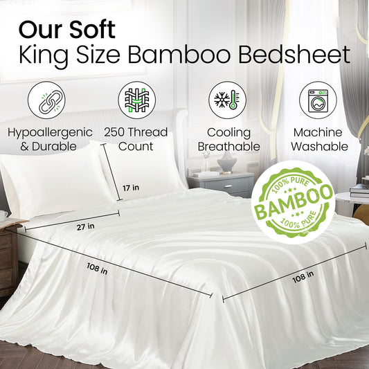100% Bamboo Bedsheet for King Size Bed with 2 Pillow Covers | 250 TC King Size - 108 x 108 inches | Luxuriously Soft, Breathable & Naturally Anti Microbial Thermoregulating Bed Sheet | White