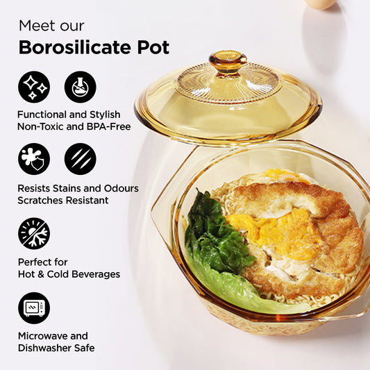 Borosilicate Glass Casserole with Lid | Glass Bowl | Microwave Safe & Dishwasher safe | Casserole for Biryani, Pulao, Halwa, Curries, Roti | Scratch resistant, BPA free | Amber Color (1.1L)