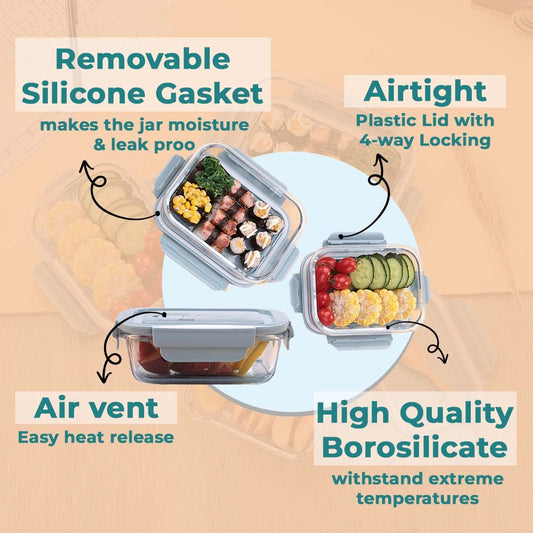 Borosilicate Glass Lunch Box Set of 3 (1040ml each) | Tiffin Box for Office for Men Women |Lunch Box for Women School Kids |Microwave Safe Leak Proof Airtight Lunch Boxes (Blue)