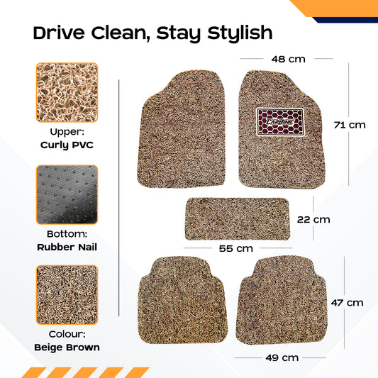 CARBINIC Anti Skid Car Mats - Universal Fit - For All Cars Curly/Noodle Car Floor Mat All Weather Pvc Car Mat Premium Vinyl Rubber Car Mats Car Accessories Set Of 5- Beige Brown