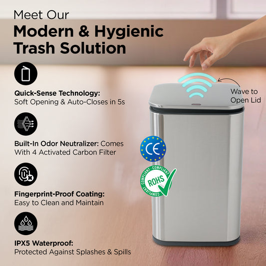 13L Stainless Steel Dustbin For Kitchen | Touch Sensor | Soft Close Lid Ozone Sanitizing | Kitchen & Bathroom Bin | Garbage Bin | Trash Can For Office- Silver