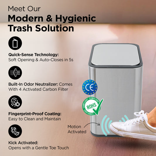 9L Stainless Steel Automatic Dustbin With Lid | Dustbin For Kitchen With Inner Bucket | Dustbin For Bathroom | Kick Activated | Dustbin For Bedroom, Home & Office | CE & ROHS Certified | Silver