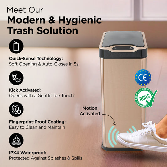 Stainless Steel Dustbin With Lid | 12L | Dustbin For Kitchen | Dustbin For Bathroom | Dustbin For Bedroom | Automatic Smart Sensor Dustbin | Dustbin For Home & Office | Gold
