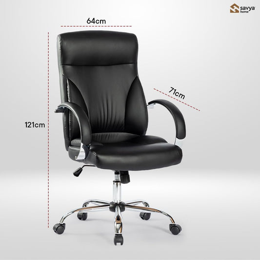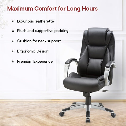 Leatherette Executive Office Chair|Study Chair for Office, Home|High Back Ergonomic Chair with Chromed Armrest for Office, Spacious Cushion Seat & Heavy Duty Chromed Base, Black
