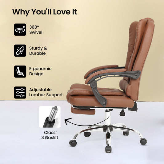 Virtue Plus Ergonomic High Back Leatherette Office Chair | Work from Home Desk Chair | Lumbar Support | Cushioned Armrest & Footrest | 135 Degree Tilt and Lock Mechanism- Brown