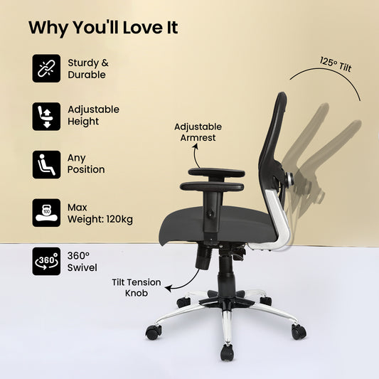 Apollo Mid Back Ergonomic Office Chair with Adjustable Arms and Anyposition Tilt Lock Mechanism (2D Lumbar Support & Contoured Meshback, 1 Piece) (Grey)