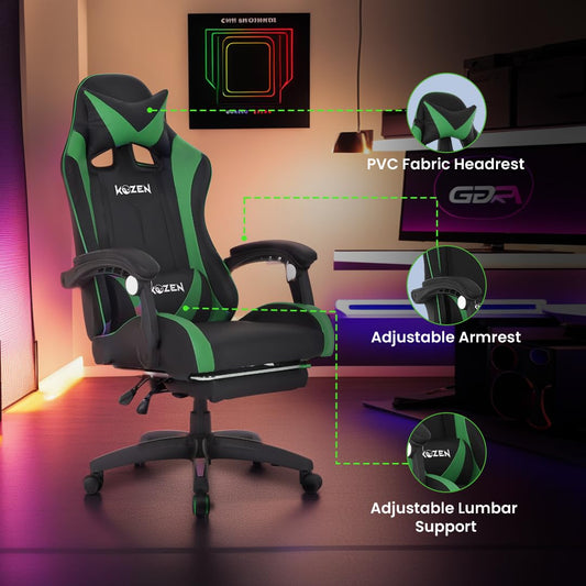 Kozen Sniper Gaming Chair With Adjustable Headrest & Lumbar Support,135° Recliner Chair | Stretchable Armrest With Footrest, Multifunctional Chair, Blue (Green) - Polypropylene