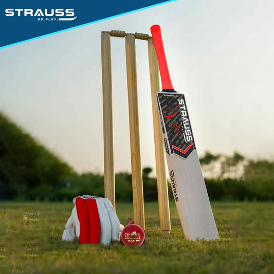 Strauss Kashmir Willow Right Hand Leather Cricket Kit | Size: Full Size | Ideal for Age 13+ | Cricket Accessories for Boys | for Training & Matches | Set of 10 | Includes Leather Cricket Ball, (Red)