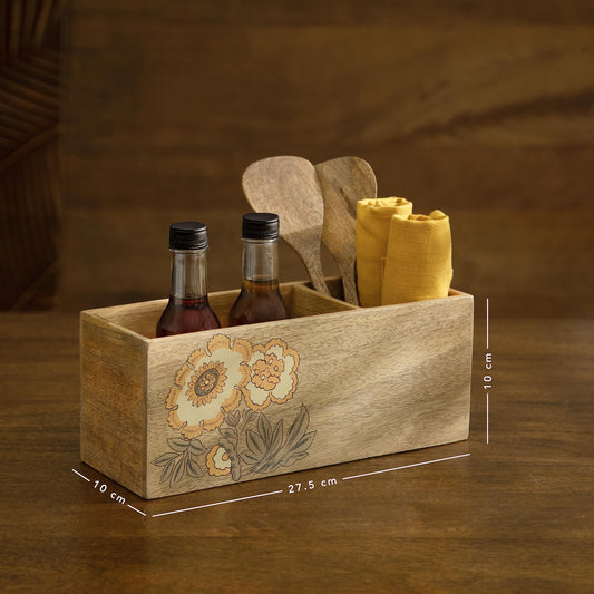 Fleur D'or Wooden Cutlery Holder | Premium Spoon, Knife and Fork Stand for Dining Table | Wooden Multipurpose Spoons Organizer for Kitchen | Handcrafted Tableware Storage Box