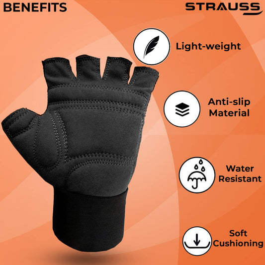 STRAUSS Suede Gym Gloves for Weightlifting, Training, Cycling, Exercise & Gym | Half Finger Design, 8mm Foam Cushioning, Anti-Slip & Breathable Lycra Material, (Black), (Small)
