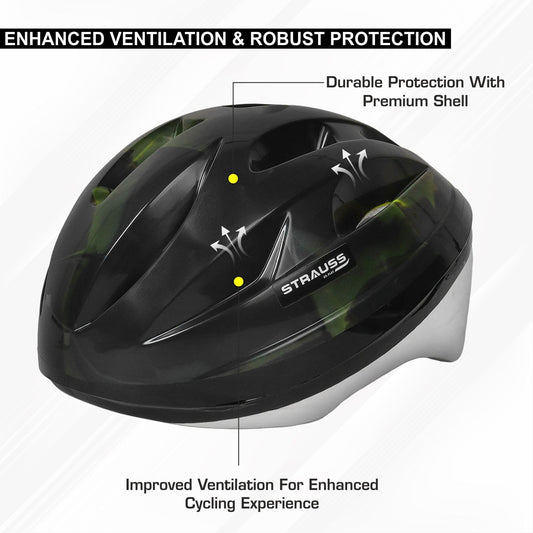 Strauss Cycling Helmet, ELITE | Light Weight with Superior Ventilation | Mountain, Road Bike & Skating Helmet with Premium EPS Foam Lining| Ideal for Adults and Kids | Size: Senior,(Black and Green)