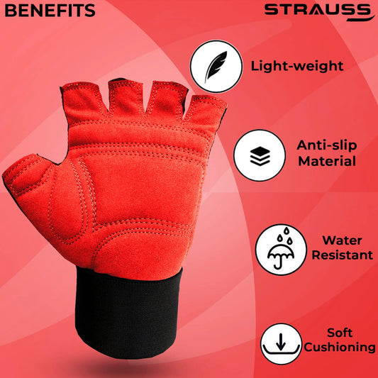 Strauss Suede Gym Gloves for Weightlifting, Training, Cycling, Exercise & Gym | Half Finger Design, 8mm Foam Cushioning, Anti-Slip & Breathable Material, (Red/Black), (Medium)