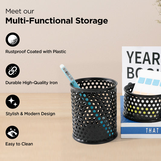 Combo: Pen Holder & Clip Holder Set | Metal Mesh Design | 8.4cm x 10cm, 8.4cm x 5.1cm | Black