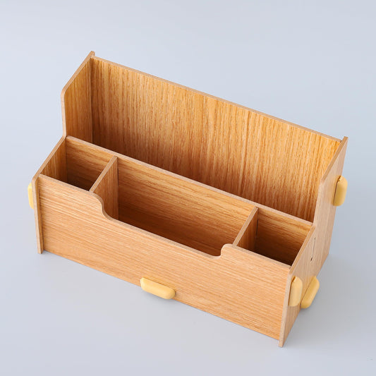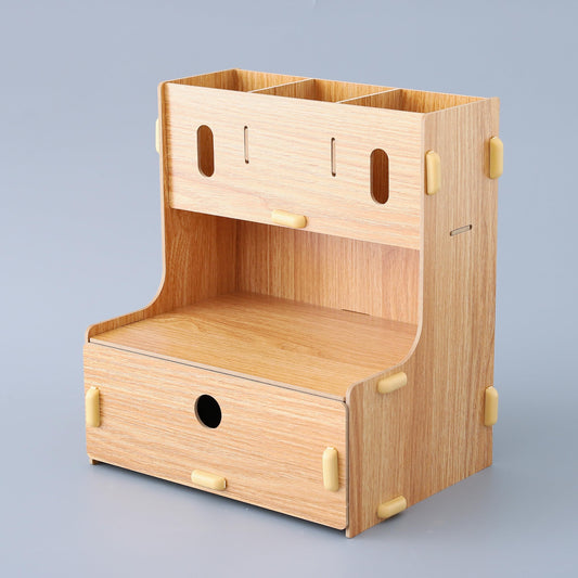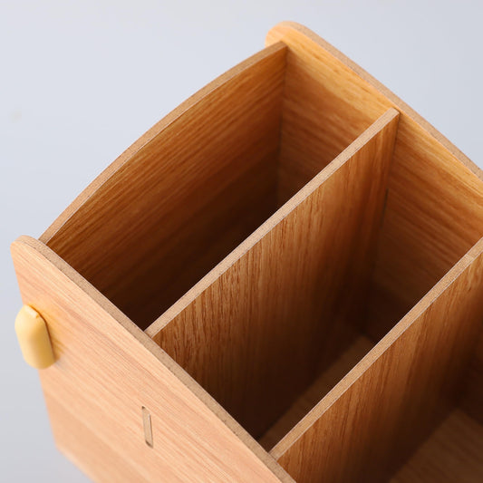 3 Compartments with One Bottom Drawer Pen Stand for Office | MDF Wood Rack | Aesthetic Stationery Stand for Office Table Accessories | Burlywood | 23.3x17.5x25.5cm