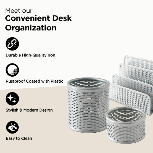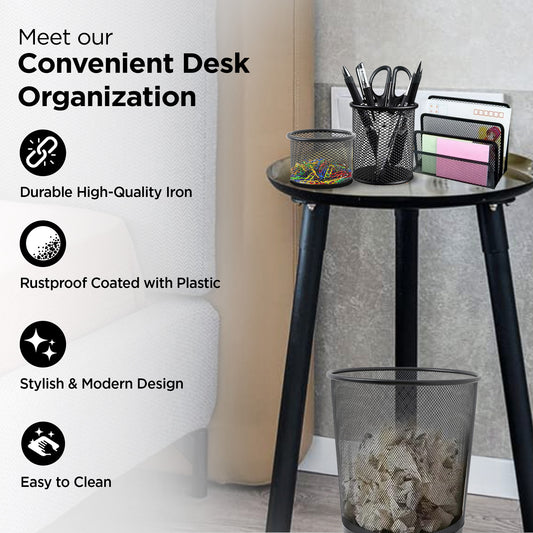 Office Desk Accessories Set of 4- Dustbin, Pen Holder For Office, Paper Clips/Pins Holder & Books Diaries Files Holder | Metal Mesh Design Space Saving Organizer For Office Reception Table