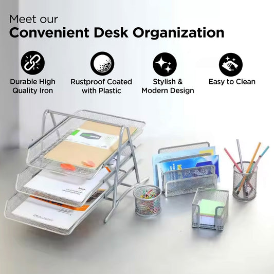 Set of 5 Office Desk Accessories | 3 Tier File Rack Pen Holder For Office, Visiting/Business Cards Holder, Books Diaries Newspaper Holder, Paper Clips Holder Metal Mesh Design