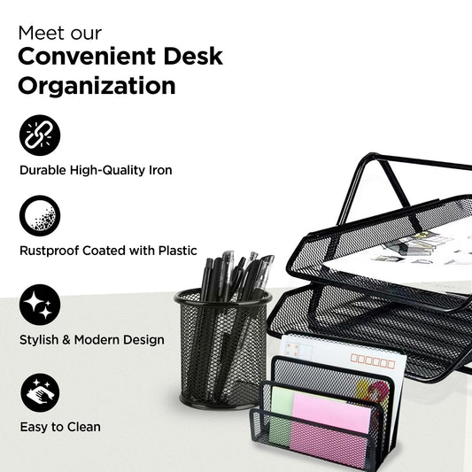 Office Desk Accessories Set of 5 Pen Holder For Office, 2 Tier File Rack, Books Diaries Holder, Paper Clips Holder, Business Card Holder | Office Table Accessories Metal Mesh Design