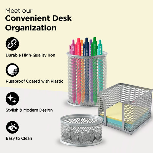 Pen Holder For Study Table, Paper Clips Holder & Paper Holder For Desk (Set Of 3) Pen Holder For Office, Reception Table | Office Table Accessories | Metal Mesh Design