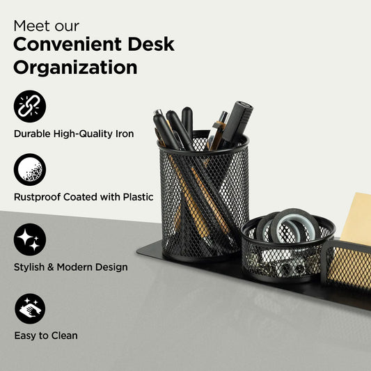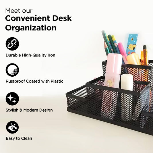 Desk Supplies Organiser with 9 Compartments | Stylish Metal Mesh Design | 22x11x10cm | Black