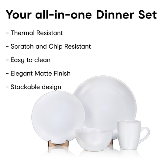 Café White 24 Piece Dinner Set/Classy Stoneware Dinner Set with 6 Side Pl6 Dinner Plates, 6 Bowls, and 6 Mugs,White Dinner Set