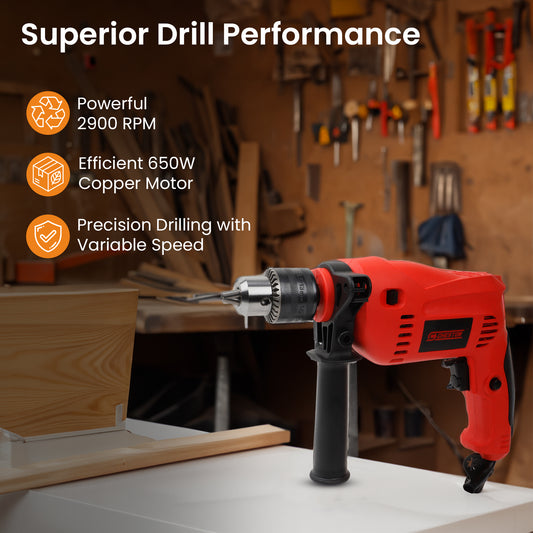 Drill Machine - 650W Motor, Hammer Function | Drill Bits Set Included | 13mm Chuck | Red