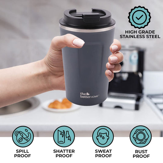 380 ml Insulated Coffee Cup Tumbler | Double Walled 304 Stainless Steel | Leakproof | Spillproof Silicone Rim | 6 hrs hot & cold | BPA Free | Perfect For Travel, Home & Office | Silver