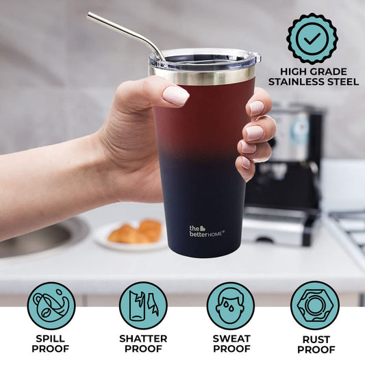 450 ml Insulated Coffee Cup Tumbler with Transparent Lid & Straw | Double Walled 304 Stainless Steel | Leakproof | 6 hrs hot & cold | Perfect For Travel, Home & Office | Maroon-Blue
