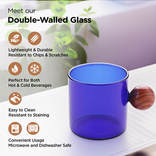 UMAI Pack of 2: Borosilicate Glass Coffee Mugs with Wooden Handle | 120ml Each | Blue