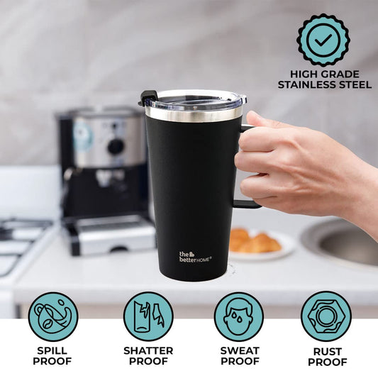 450 ml Insulated Coffee Cup Tumbler with Transparent Lid & Handle | Double Walled 304 Stainless Steel | Leakproof | 6 hrs hot & cold | Perfect For Travel, Home & Office | Black
