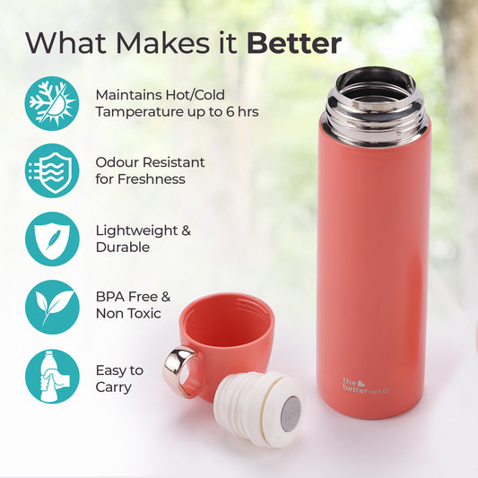 Insulated Flask 500ml with Cup | Thermos Flask | Coffee Flask & Tea Flask for Home & Office Use| Leak Proof & Rust Proof | Upto 6 Hours Hot & Cold | (Pink)