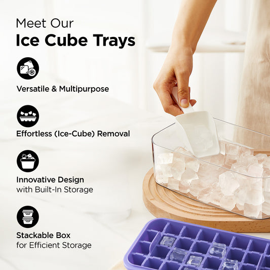 Combo: 2 Layer Ice Cube Trays with Storage Box & Ice Scoop | 56 Compartments | White