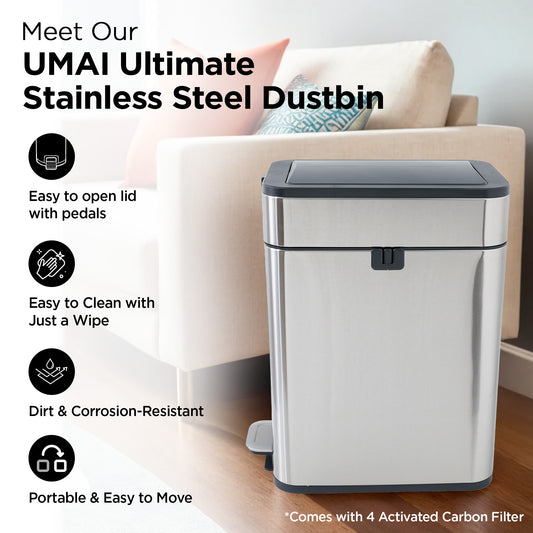 Stainless Steel Dustbin | Dustbin With Lid | 15L | Dustbin For Kitchen | Automatic Dustbin With Inner Bucket | Dustbin For Bathroom/Bedroom/Office | Activated Carbon Filter | Silver