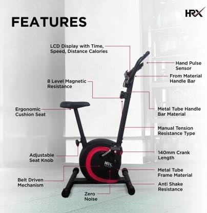 HRX Ignite CB500 Magnetic Upright Bike | 2.5Kg Flywheel | 8 level Resistance | Max weight 100kg | Upright Stationary Exercise Bike (Red)