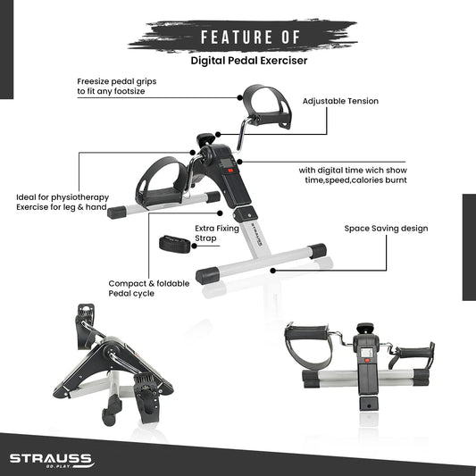 Strauss Digital Pedal Exerciser |Along with Adjustable Resistance and LCD Display | Portable and Foldable Mini Fitness Cycle | Suitable for Light Exercise of Legs & Arms, and Physiotherapy at Home