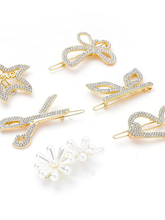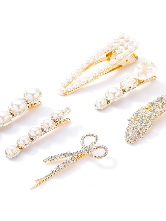 Pack of 6: Hair Clips Set - Crystal and Pearl Design | Medium Size | Gold