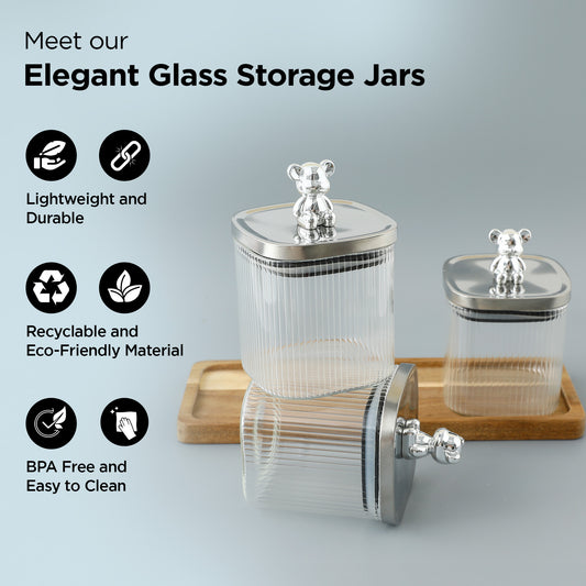 Set of 3: Borosilicate Glass Jars - Airtight, Stylish | Includes Bamboo Tray | 350ml Each | Transparent