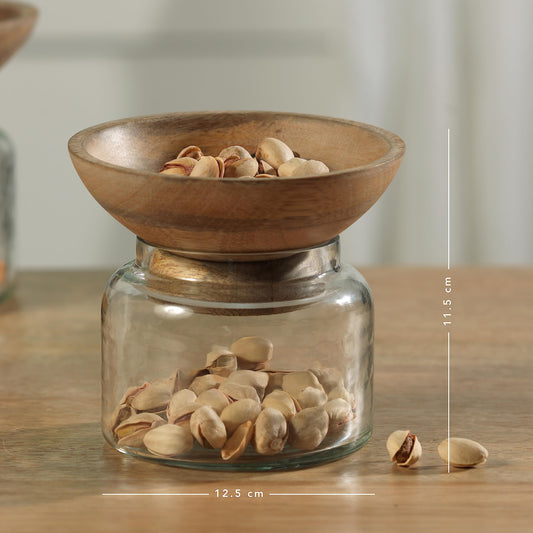 Twain Glass Jar with Wooden Bowl (200 ML) | Transparent and BPA Free | Wooden Bowl Lid | Kitchen Organizer | Modular | Multipurpose Jar | Grocery, Dry Fruit and Spice Storage Jars