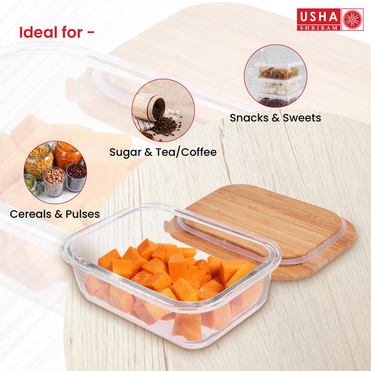 Borosilicate Food Container Insulated Steel Bottle With Bamboo Lid |Borsilicate Glass Container For Kitchen Storage | Microwave Safe (Rectangular)