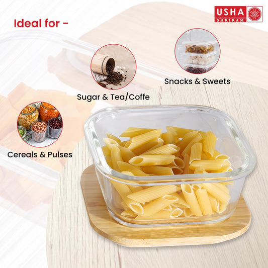 UMAI Borosilicate Kitchen Containers Set with bamboo lid | Glass containers with lid | 800ml & 1230ml | Airtight Kitchen Storage Jars | Microwave Safe | Multipurpose | Pack of 2 | Square Printed |