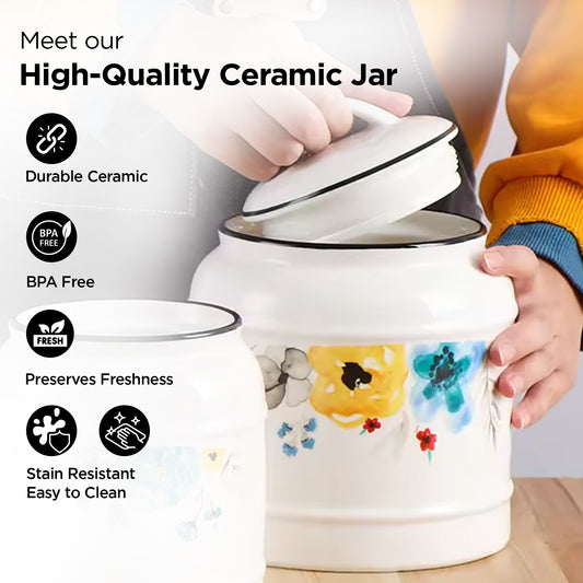 UMAI Ceramic Jar for Kitchen Storage with Lid | Airtight, BPA Free | 1400ml | Printed White
